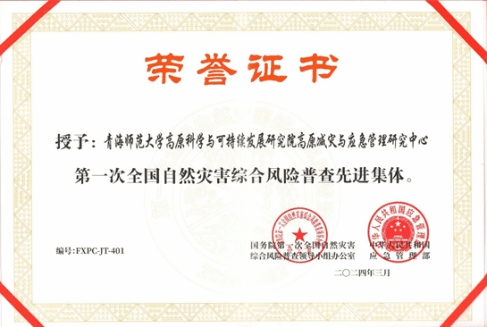 2021年,第一次全国自然灾害风险普查启动,高原防灾减灾团队凭借既有的技术优势,被青海省第一次全国自然灾害风险普查办公室列为技术负责单位,先后完成青海省以及5州25县(市)的风险评估和综合区划工作,并解决灾害风险评估技术中出现的突出问题,全校60余名技术人员,经过3年艰苦奋战,积极开展调研、培训和技术攻坚,先后完成了“一省一市”试点工作、省本级综合风险评估与区划以及全省5市(州)25个县(区)的综合风险评估与区划工作。为全国风险普查提供了青海方案和青海特色,2024年被国务院第一次全国自然灾害综合风险普查领导小组办公室和应急管理部评选为“第一次全国自然灾害综合风险普查先进集体”。