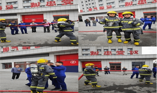 同学们在消防员的指导下实操消防水带