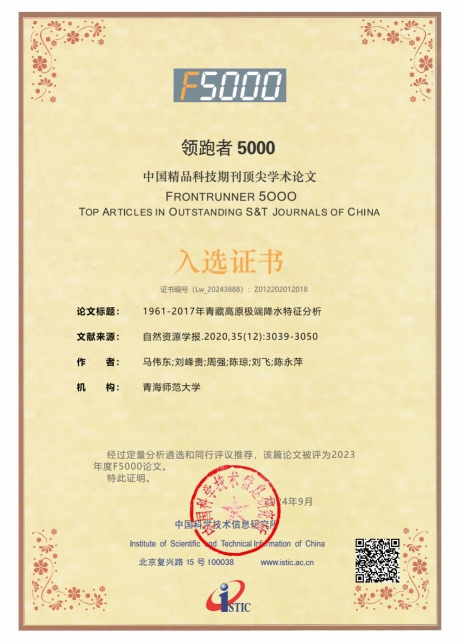 近日,科技部中国科学技术信息研究所发布了2023年度“领跑者5000—中国精品科技期刊顶尖学术论文(F5000)”入选论文名单。公司刘峰贵教授为通讯作者、马伟东副教授为第一作者发表在《自然资源学报》上的论文“1961-2017年青藏高原极端降水特征分析”入选2023年度F5000。